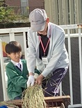 いねかりで収穫した稲穂を用い、「だっこく」の体験をしました。本校元教員の久保先…
