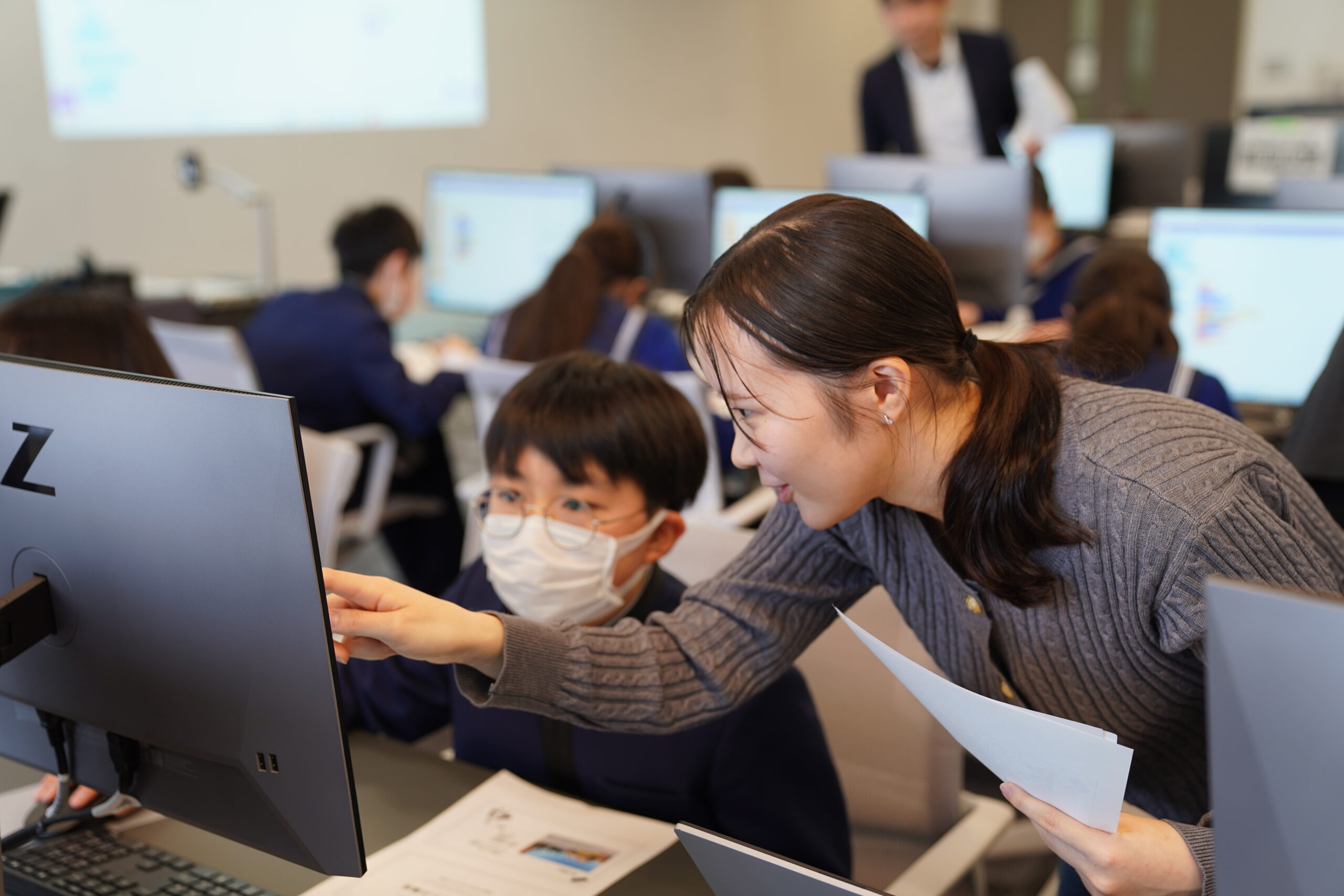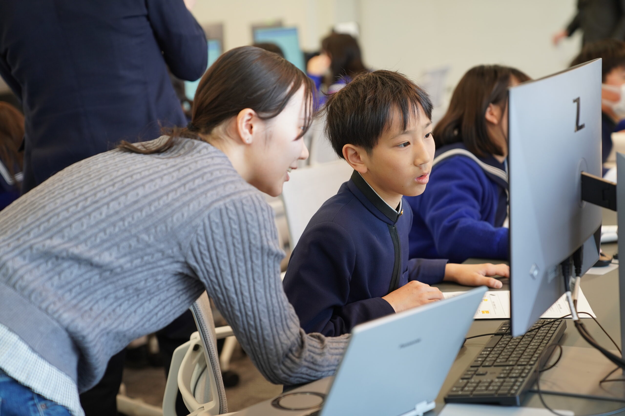 データサイエンス学部の道越秀吾 准教授と同学部3回生3名が特別授業を実施してくださいました。「SCRATCH」を使ったプログラミング学習でした。試行錯誤しながら、キャラクターを動かして迷路をクリアするためのプログラムをつくりました。真剣に取り組む子どもたちの姿が印象的でした。(j.d)