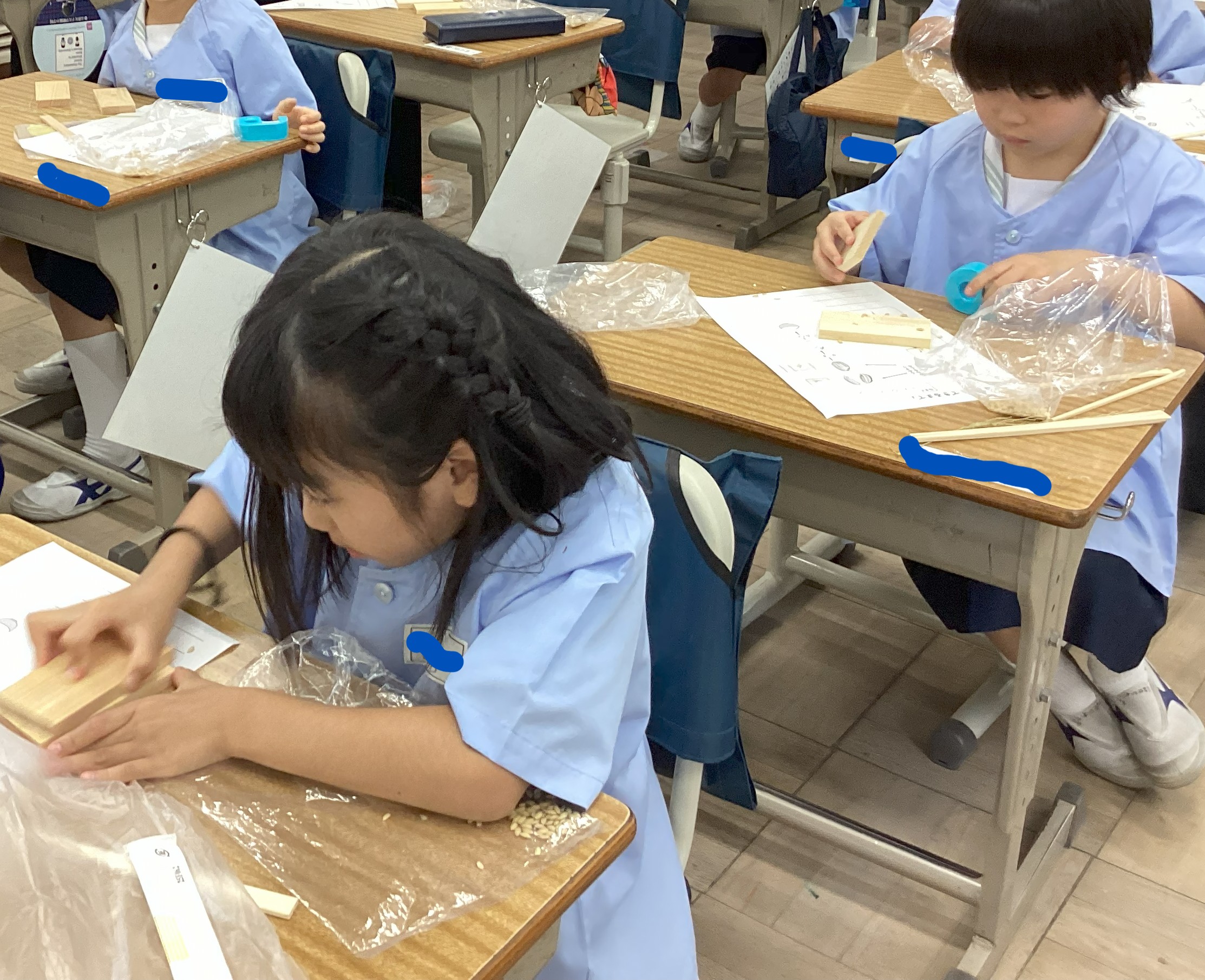 生活科の時間に脱穀ともみすり体験をしました。まずは割り箸を使って脱穀をしました。…