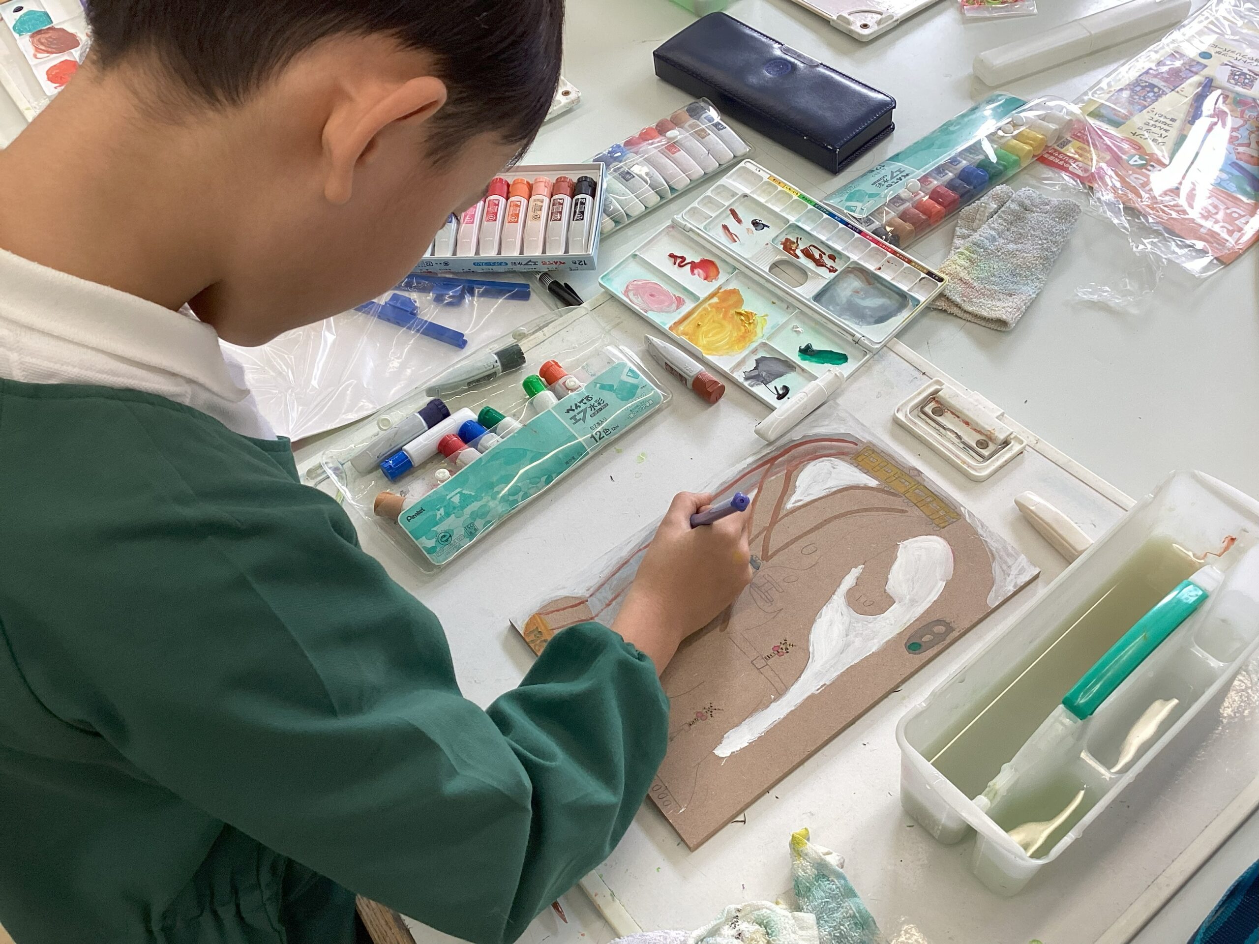 図工の時間、木の板に下絵を描いているところです。集中して制作に取り組んでいます…