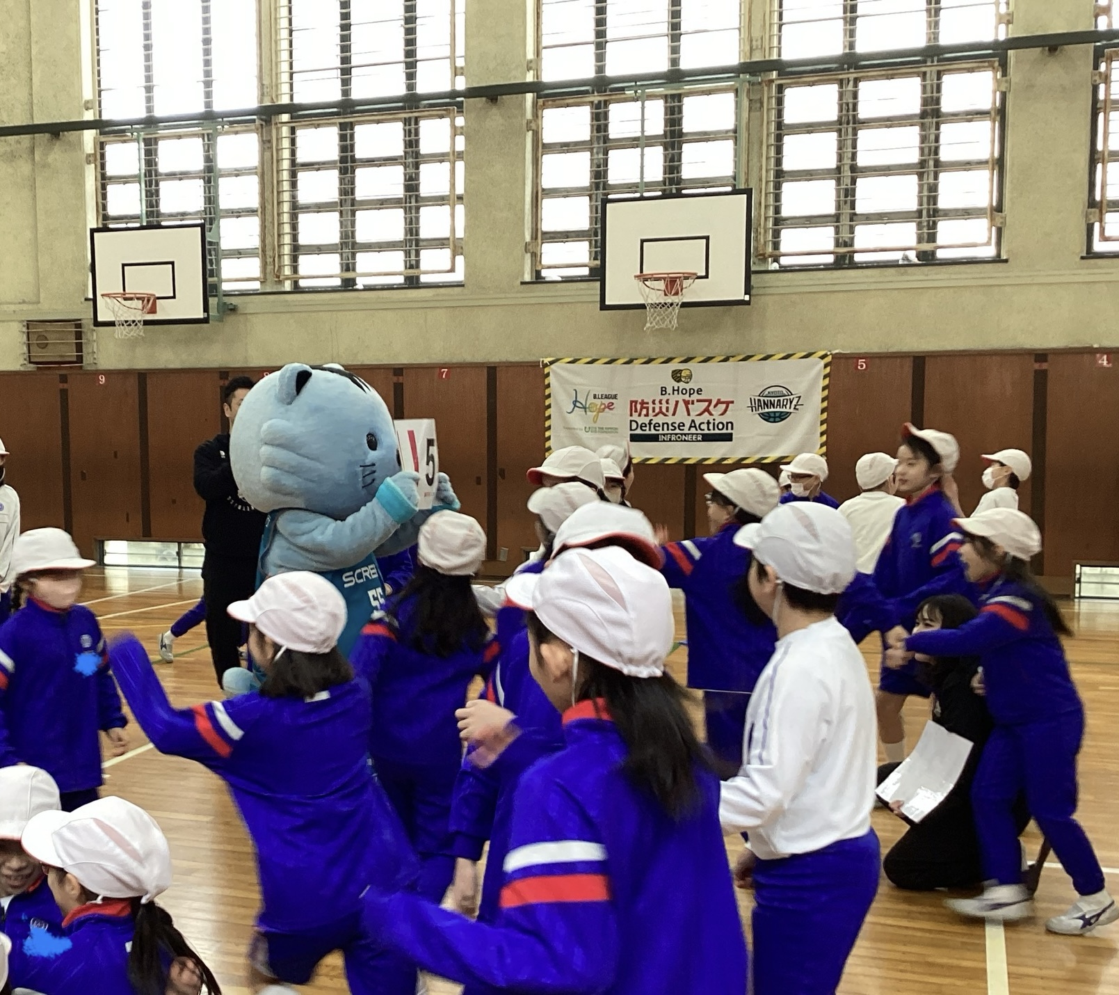京都ハンナリーズの方に「防災バスケ」をしていただきました。 マスコットのはんニ…
