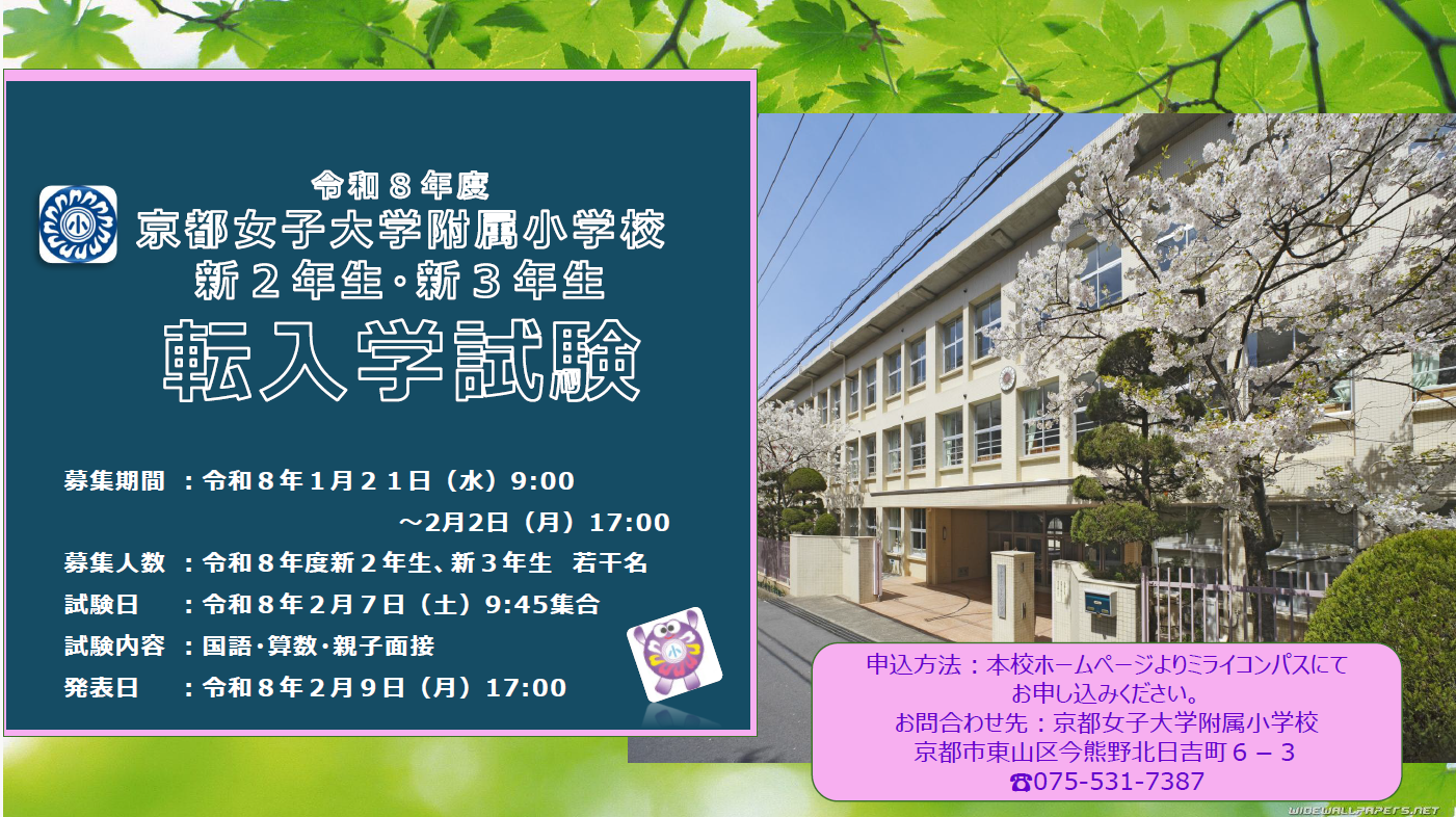 令和8年度4月入学 新2年生・新3年生 転入学試験を行います。 対象学年:令和…