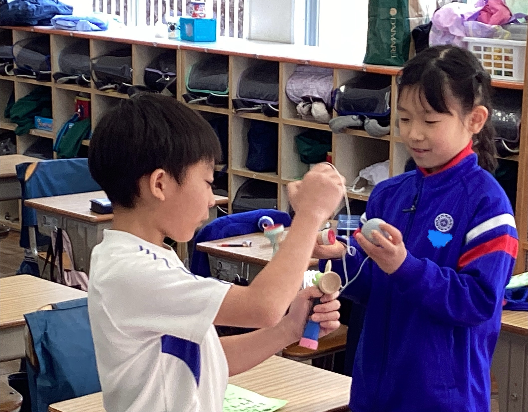 生活科の時間にけん玉遊びをしています。 けん玉検定として、「大皿」から「灯台」…