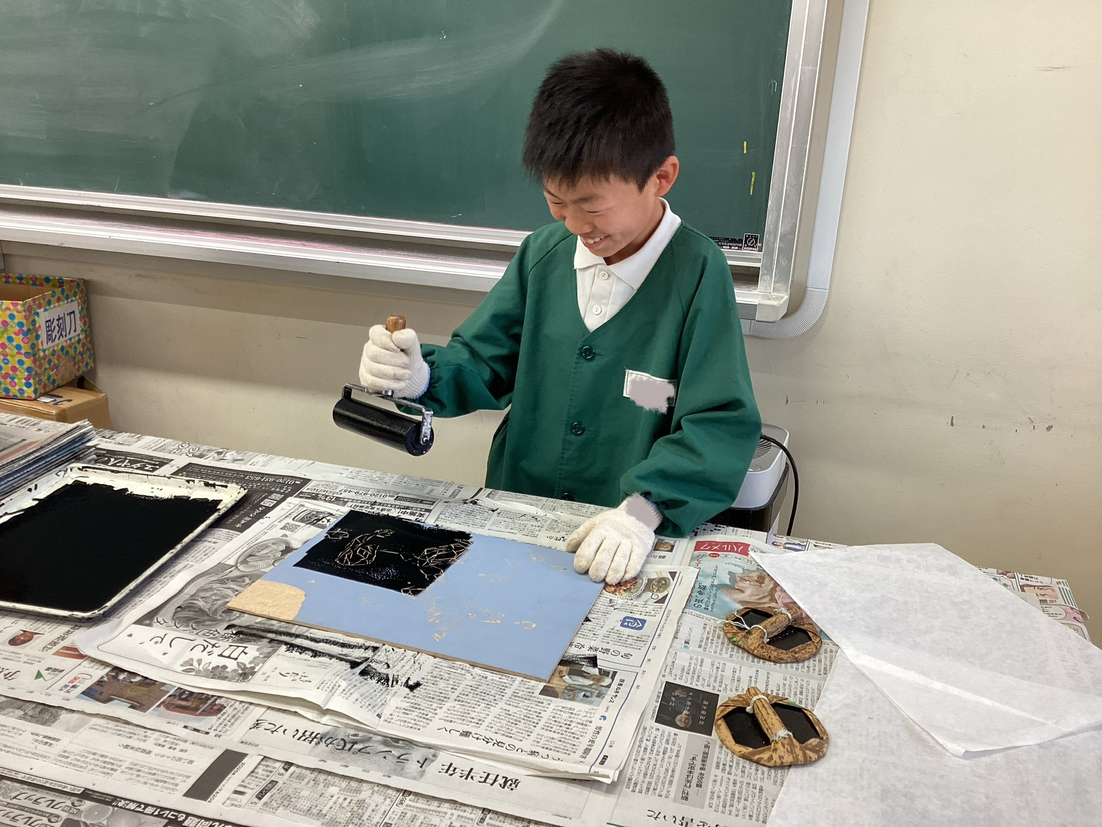図工では版画の作品をつくっています。 彫刻刀で彫った後、ローラーで色づけをしま…