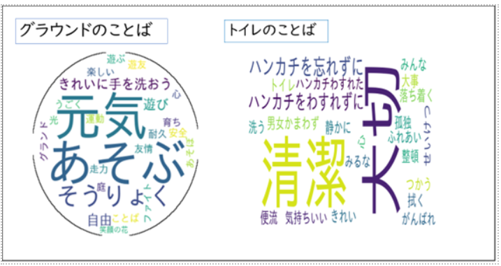 これを見てもグラウンドに関しては「元気」「あそぶ」、トイレについては「清潔」「大切」ということばがあがっていたことが分かります。