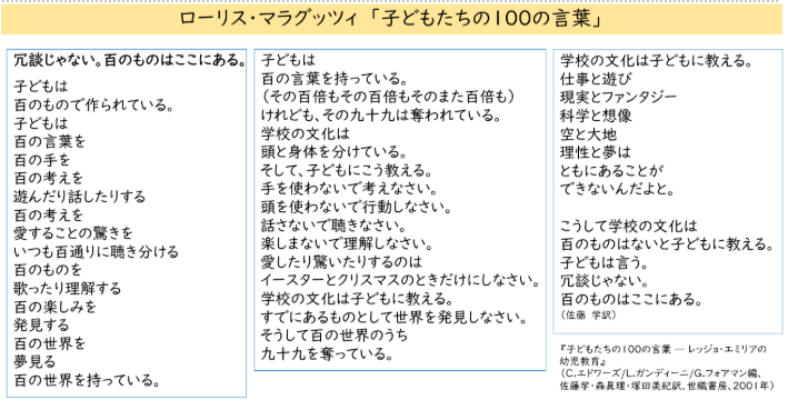 『子どもたちの100の言葉 ― レッジョ・エミリアの幼児教育』(C.エドワーズ/L.ガンディーニ/G.フォアマン編、佐藤学・森眞理・塚田美紀訳、世織書房、2001年)
