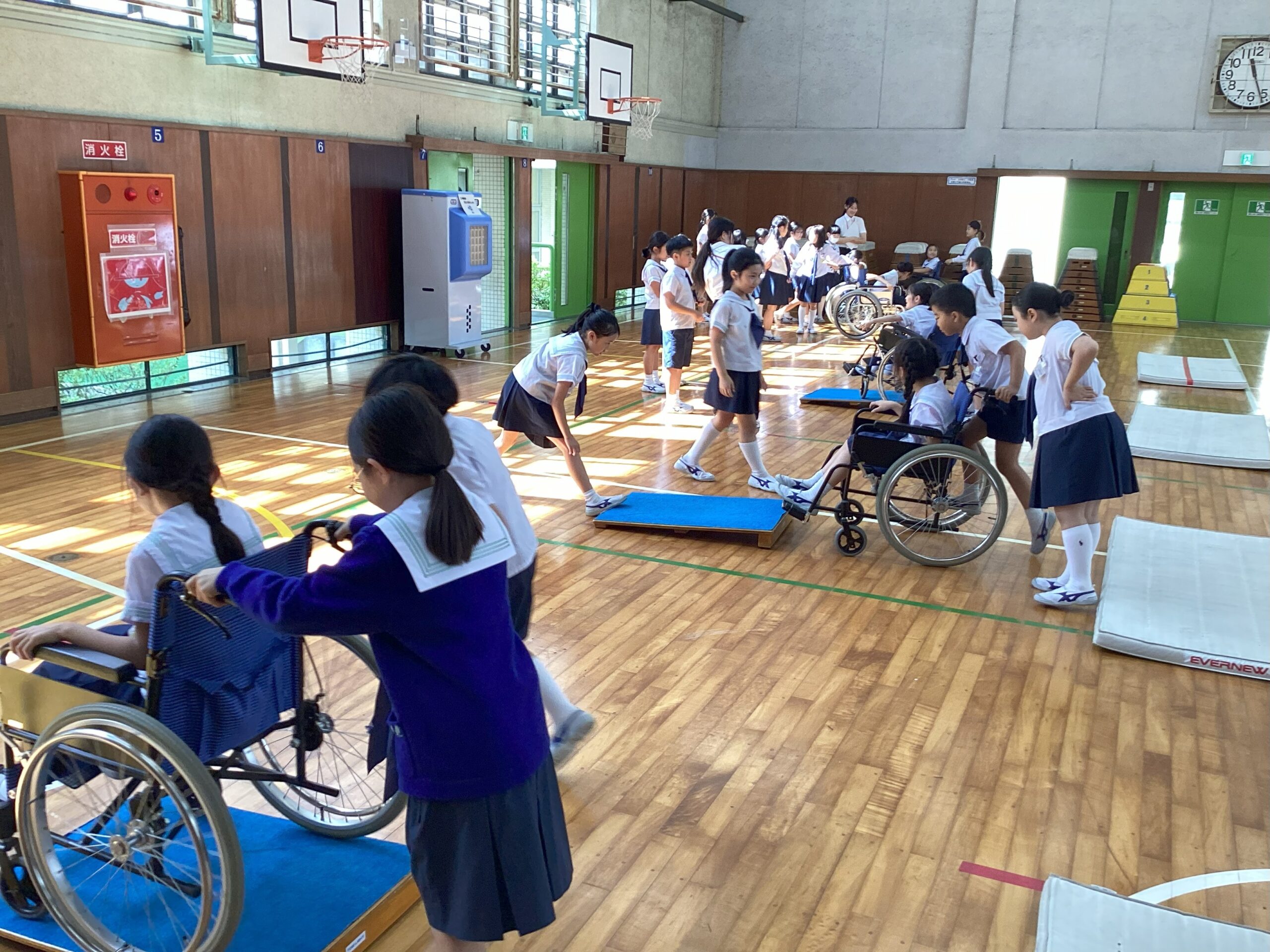 総合の時間に車いす体験をしました。「押していると、小さな段差でも上がるのが大変だった」「乗っていてガタンとなるのがこわかった」など、体験してみて気づいたことがたくさんあった様子でした。