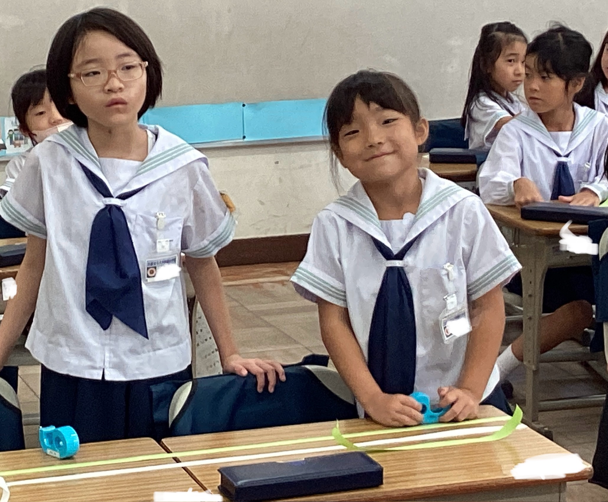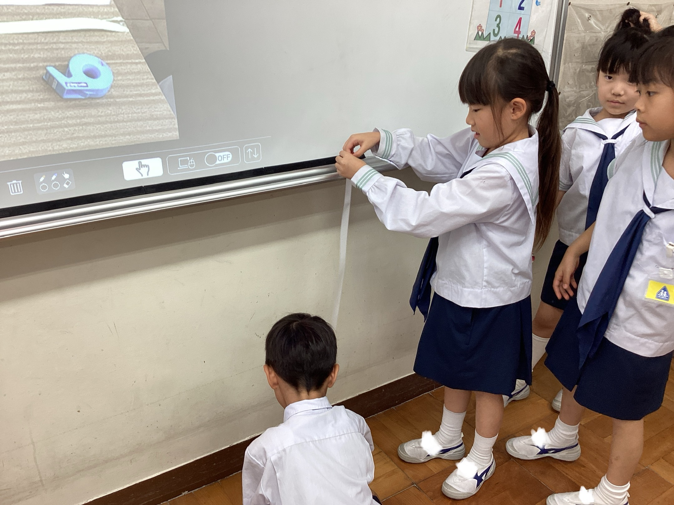 ホワイトボードとロッカーのどちらが高いか、テープを使って調べました。