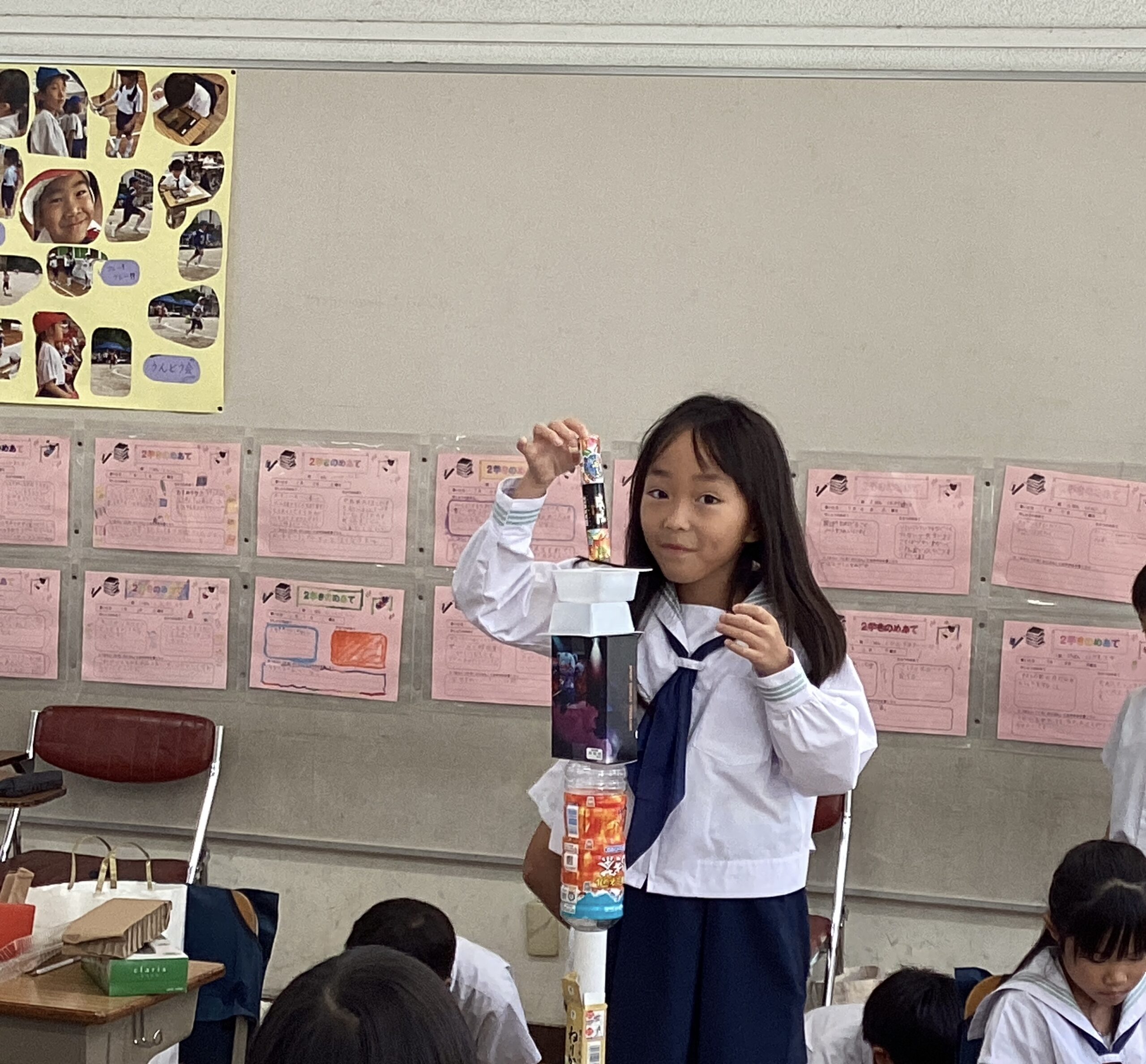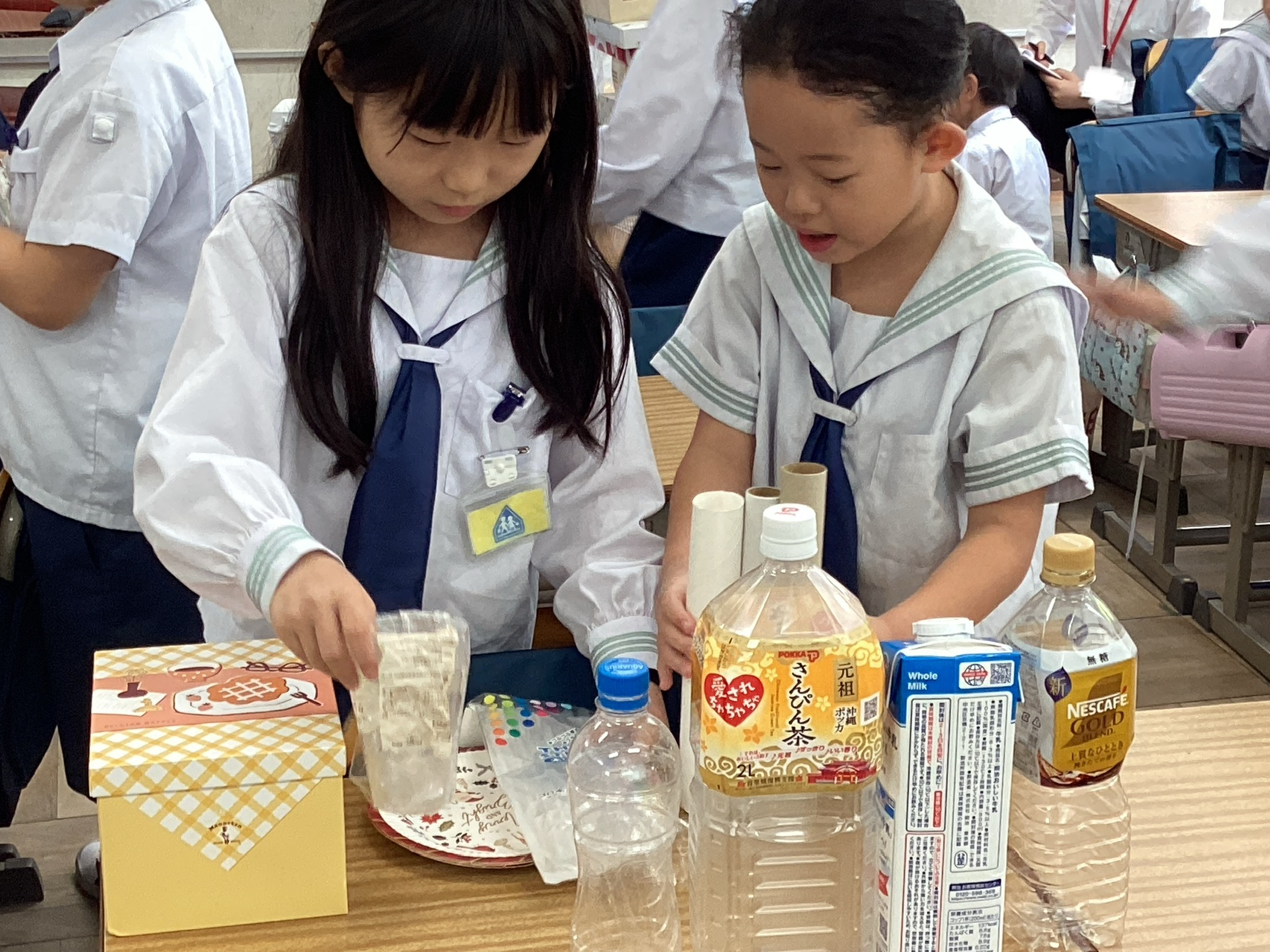 生活科の時間に、箱やペットボトルなど身の回りにあるものを利用して遊びました。
