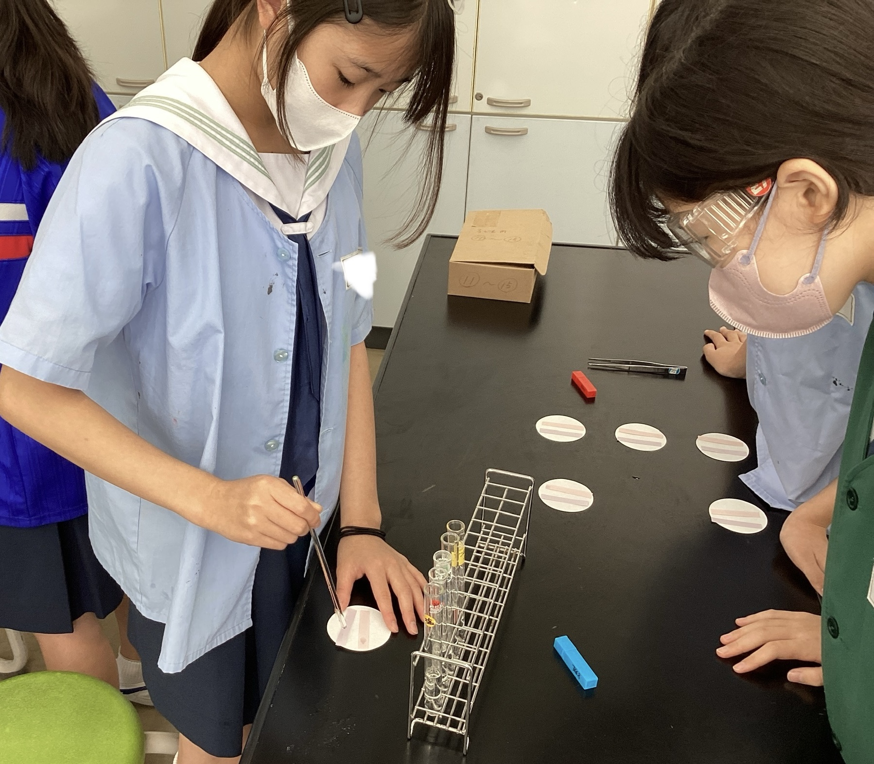 食塩水、炭酸水、塩酸、重曹水、アンモニア水の5つの水溶液を、リトマス試験紙を使って仲間分けしました。