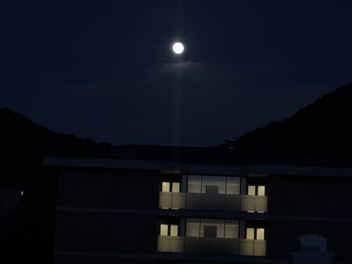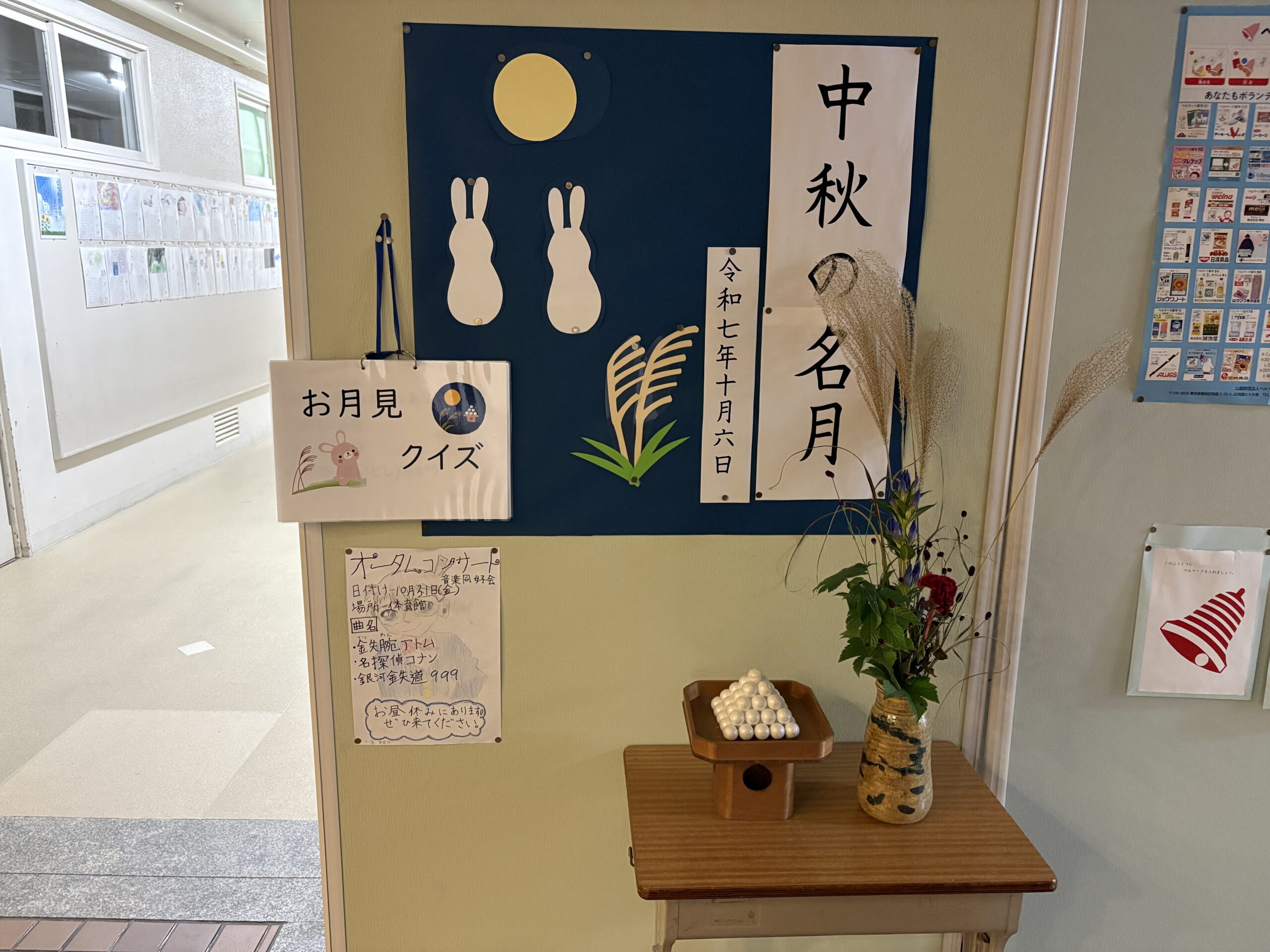 10月6日は中秋の名月です。附属小学校の正面玄関には中秋の名月のポスターやススキ、お月見団子などが飾られています。今日の給食には、中秋の名月にちなんだメニューがたくさん出てきましたね。夜、小学校の屋上に行くと、綺麗な月が見えていました。実際に写真を撮ってみました。模様まで綺麗に写っています。明日は満月です。ぜひ空を見上げてみてくださいね。