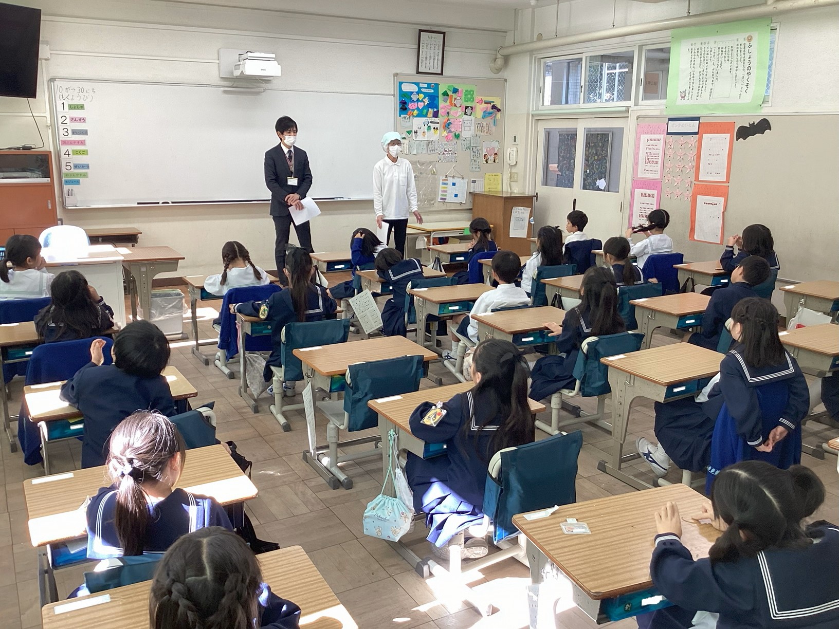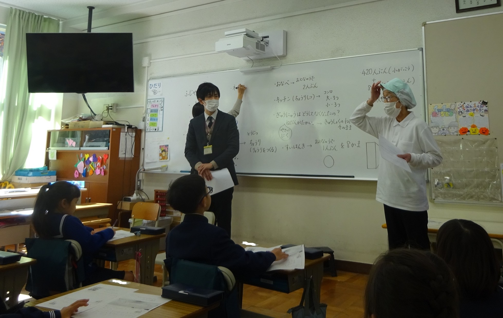 給食調理員さんを教室にお招きして、給食の作り方や給食センターについてインタビューしました。毎日食べている給食について知りたかったことを質問すると、1つ1つに丁寧に答えてくださいました。子どもたちは、朝早くから500人分の給食を作っておられることに、驚いていました。明日からの給食、みんなでおいしくいただきましょう。