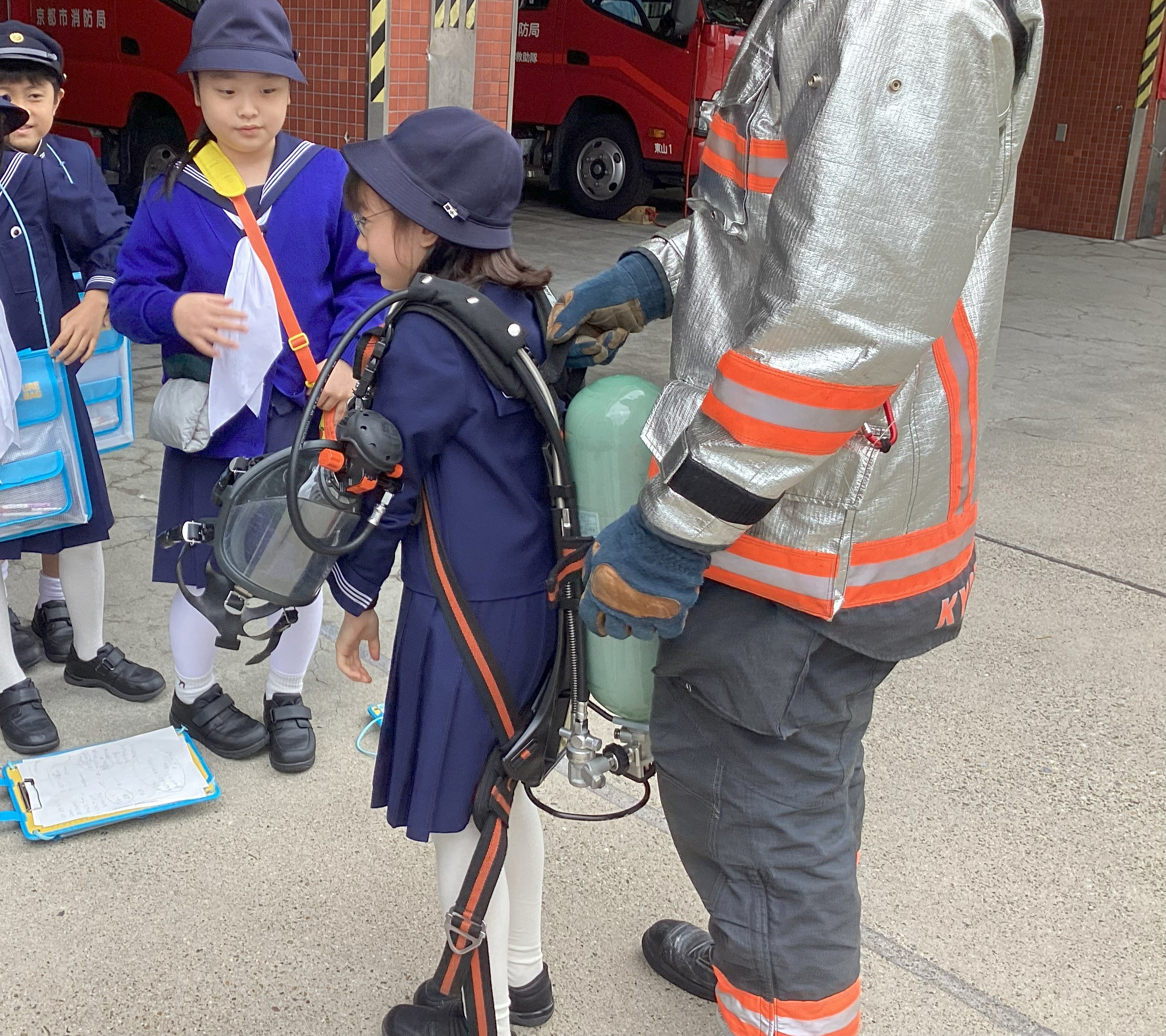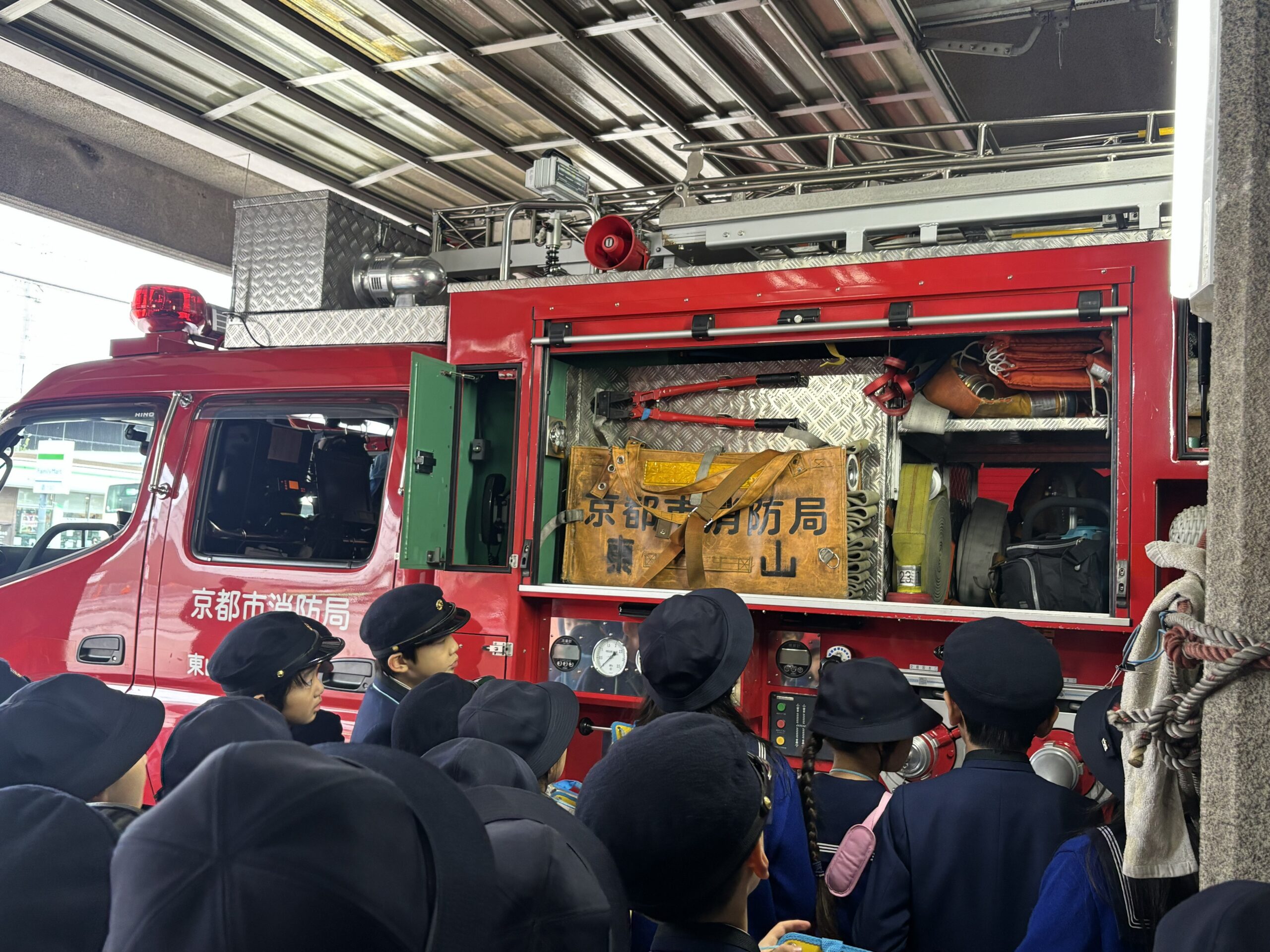 社会科の学習で、東山消防署へ見学に行きました。東山区の火災の実態や東山消防署の設備などについて教えていただき、子どもたちからのたくさんの質問にも答えてくださいました。いろいろな種類の消防車の中を見せていただき、子どもたちは食い入るように見ていました。消防士さんが持っている荷物を実際に持たせてもらった際は、「重い!」と思わず漏らしていました。