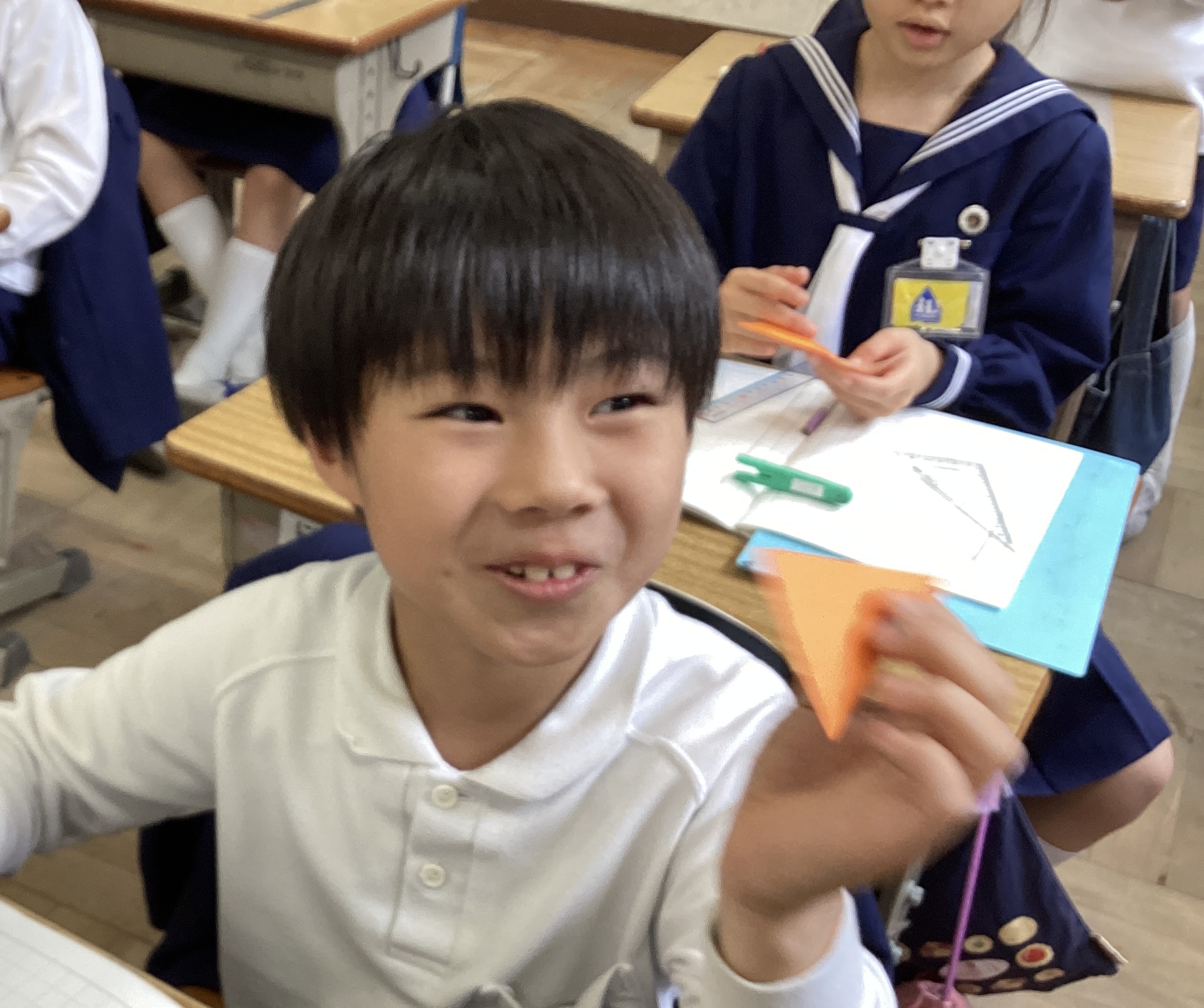 三角形を直線で2つに切ると、どんな図形ができるかを学習しました。