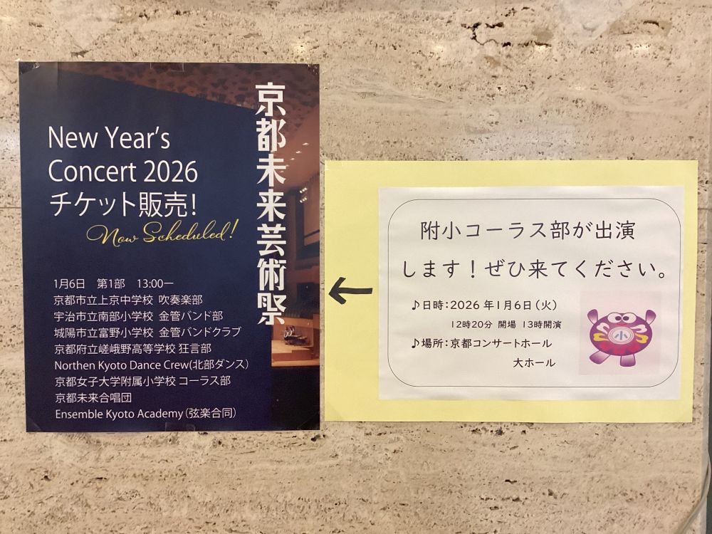 来年1月6日(火)に京都コンサートホールで開催される「京都未来芸術祭 ニューイヤーコンサート」にコーラス部児童が出演します。9月からの2学期はこのコンサートに向けて毎日、熱心に練習に励んできました。曲数が多く、最初は音取りなどが大変でしたが、12月に入り、歌声がひとつにまとまってきました。コンサート当日は、京都府内の中学生や高校生と歌うステージもあります。お時間のある方はぜひお越しください。お待ちしています。