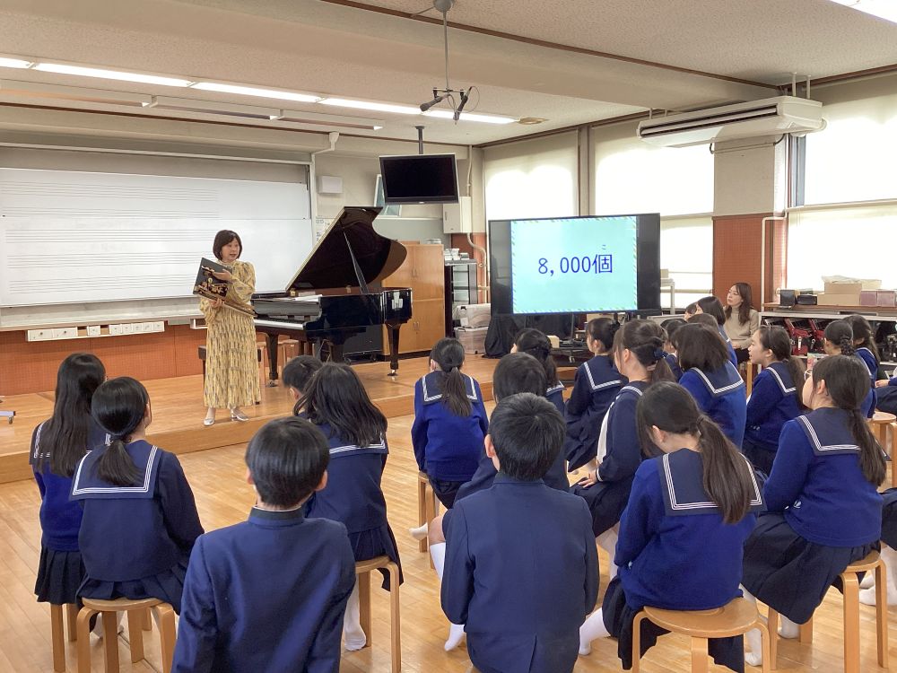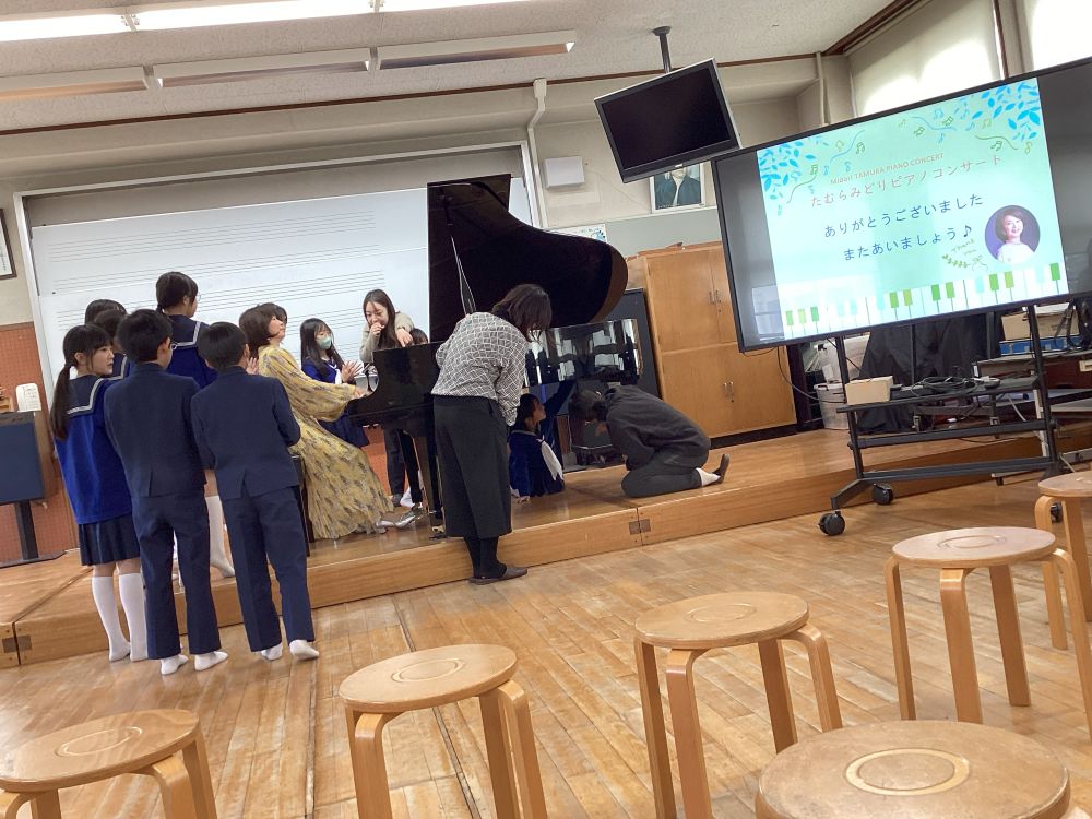 今日は京都コンサートホール主催のアウトリーチ授業でピアニストの田村緑さんが来てくださいました。ピアノの演奏の他、楽しいクイズやピアノの秘密、作曲家の偉大さなど、40分間という時間の中、たくさんのことを教えてくださいました。授業の最後にはサプライズとして、来年2月の音楽会で演奏する「チキチキバンバン」を3人で連弾してくださり、1人ずつピアノのハンマーを見たり、ピアノの下をもぐって響板を触ったり、普段できないことを体験することができました。初めてお会いしましたが、子どもたちもすぐに音楽の魅力に溶け込み、とても和やかな時間となりました。田村緑さん、京都コンサートホールの皆さん、ありがとうございました。