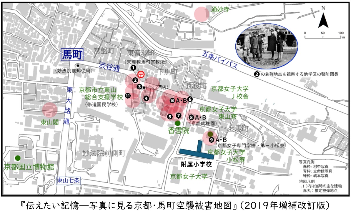 その後、空襲被害の様子を捉えた新たな写真が見つかり、京都女子大学の学生たちによって分析が行われました。その成果は『伝えたい記憶―写真に見る京都・馬町空襲被害地図』としてまとめられ、2018年1月に報告されました。上掲の被害地図はその増補改訂版です。