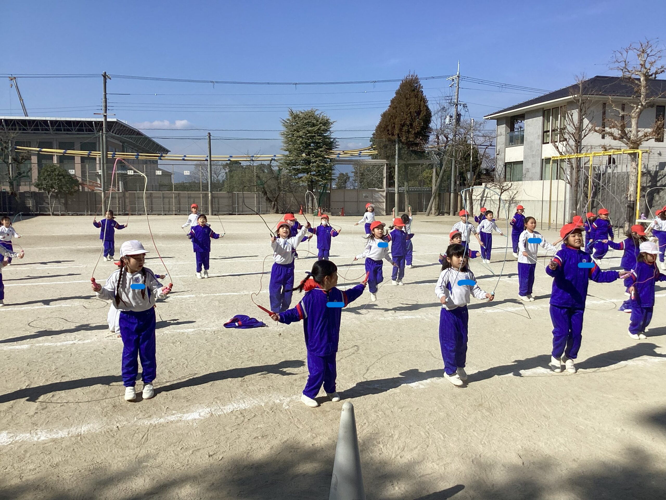 寒い日が続きますが、子ども達は元気いっぱいです。体育の時間に1年生全員で電子レンジ鬼ごっこと縄跳びをしました。電子レンジ鬼ごっこは、こおり鬼と似たルールで、鬼にタッチされた人を助けるためには仲間二人で手を繋ぎ「電子レンジ、チン」と言いながらつないだ手を上から下に通します。一人ではなく友達を見つけて協力して助けます。