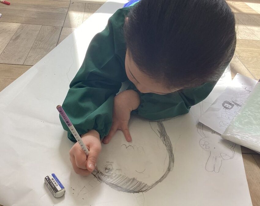 図工科では、生活科「広がれ わたし」とつなげて、自分の型を模造紙に描き、等身大サイズの自分を描きました。