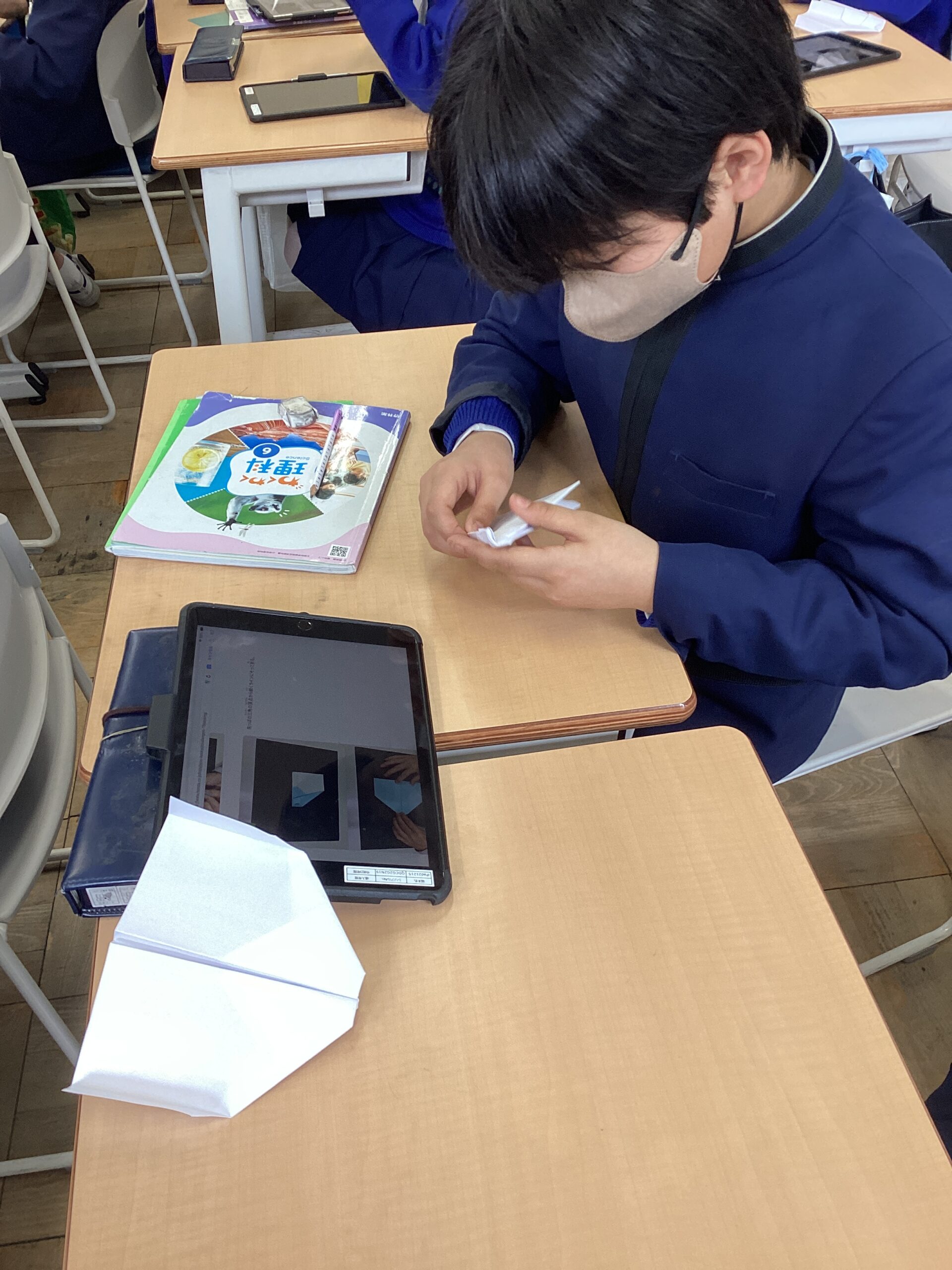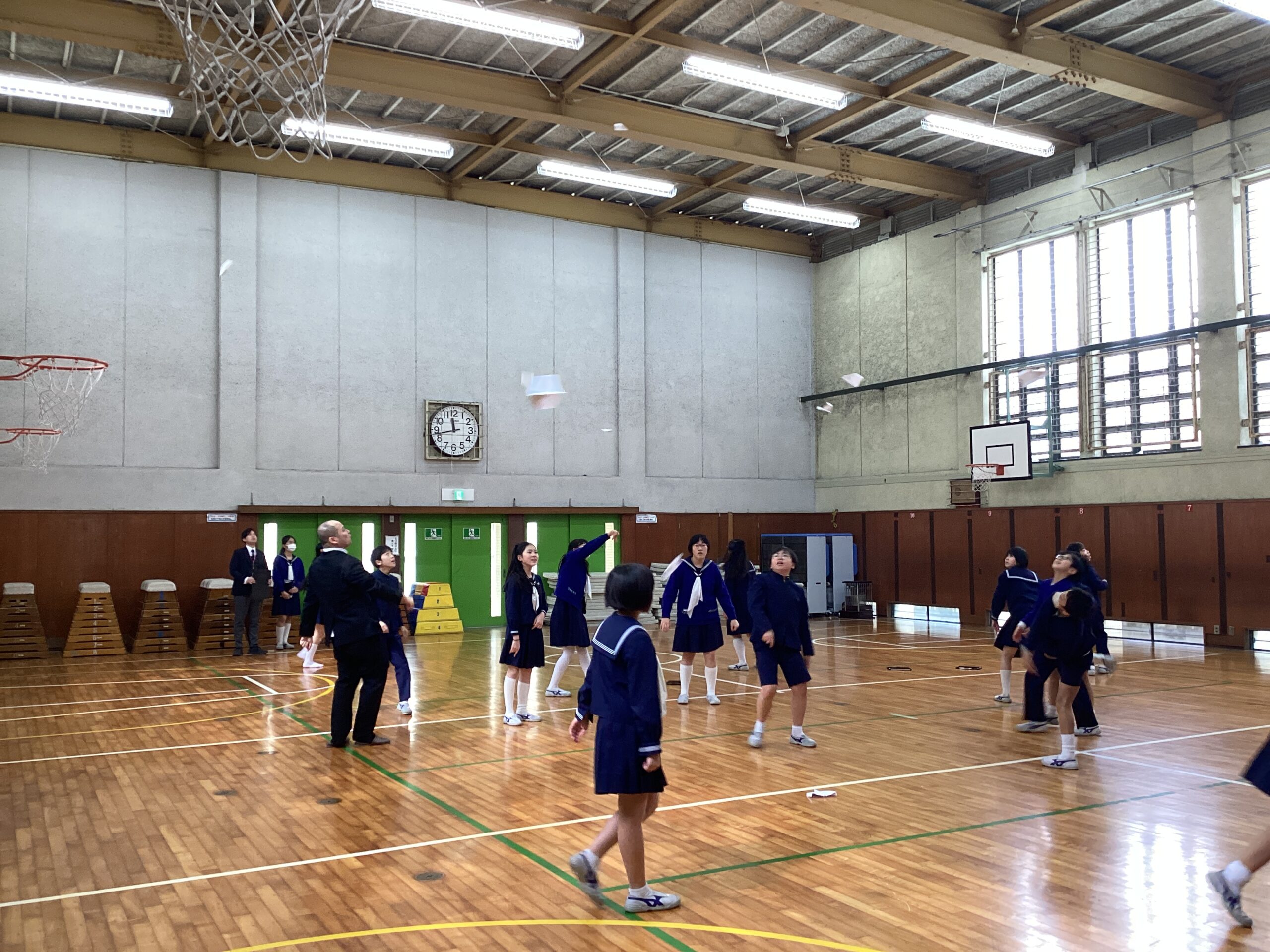 今日の6年生の理科は、京都女子大学の仲井先生に来ていただきました。今日のテーマは「滞空時間の長い紙飛行機」でした。実際に作って体育館で飛ばしてみると、10秒以上も空を飛んだ紙飛行機もありました。1秒でも長く飛ばそうとがんばる6年生の姿が印象的でした。